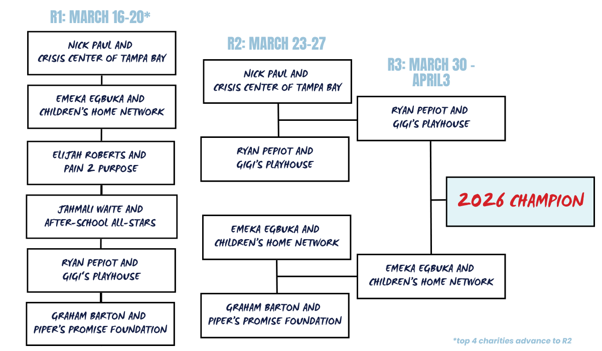 Each round, the athlete-charity teams that raise more money than their competitors advance to the next round. Donations received from the previous round do not carry over—each round starts fresh! -